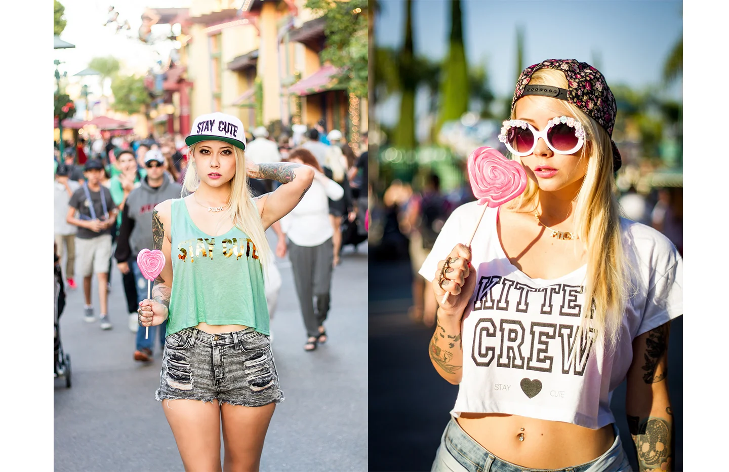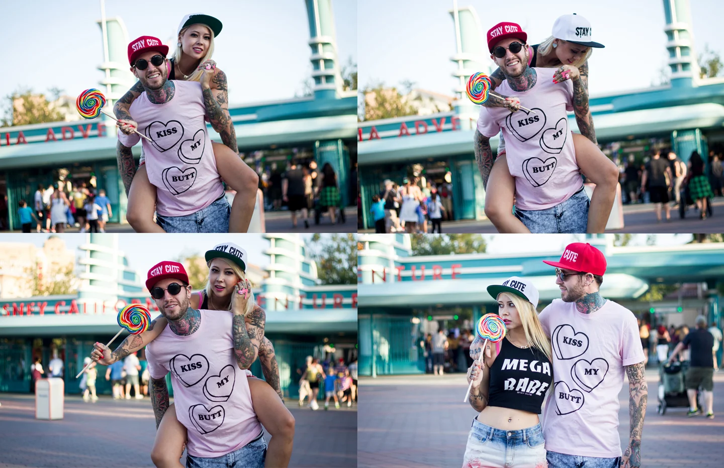 Jason: Red & Pink logo snapback, Kiss My Butt unisex tee // Mandee: Meba Babe Black Crop Top, Classic Black & White Logo Snapback